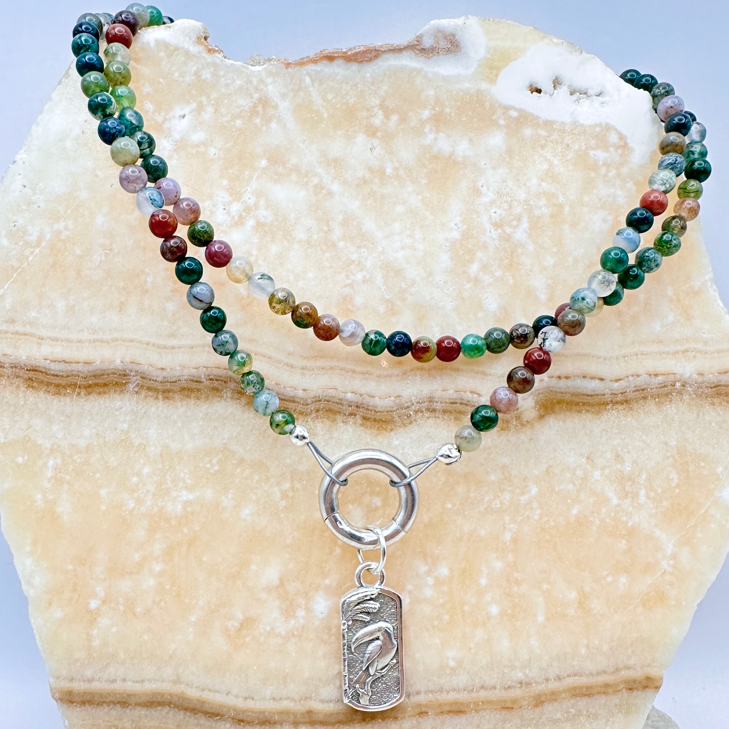 Finished with our signature handcrafted toucan pendant, this necklace carries a touch of tropical artistry - bold yet elegant. The pendant is fully removable, allowing you to switch seamlessly between a statement piece and a simple, refined strand. A sterling silver loop clasp completes the design.