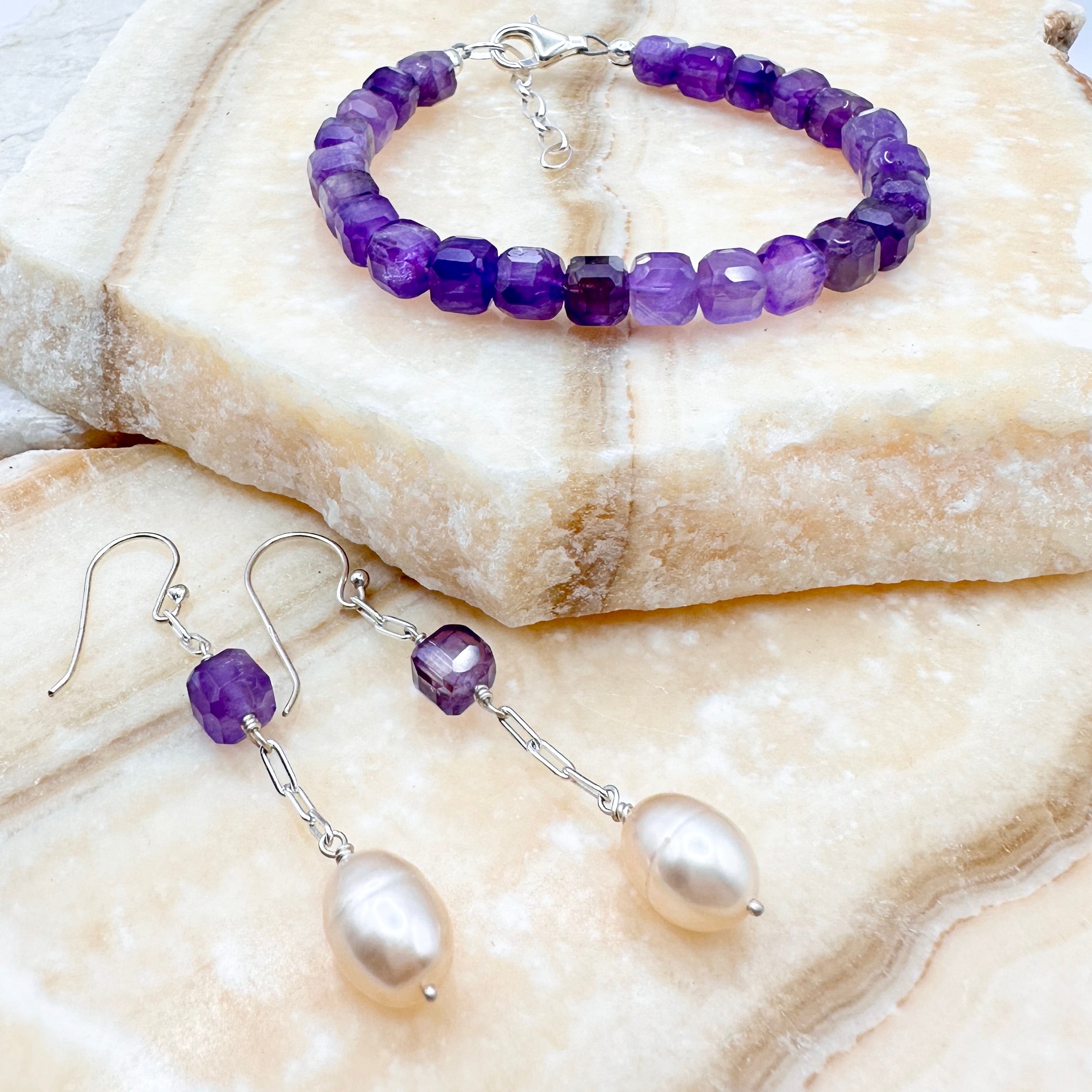 These gemstone earrings feature vibrant faceted amethyst hand-selected for their quality and luminous fresh water pearls. Thoughtfully designed for effortless, everyday wear, they add a touch of refined sparkle - perfect for pairing with your favourite cozy knits or elevating your evening look.